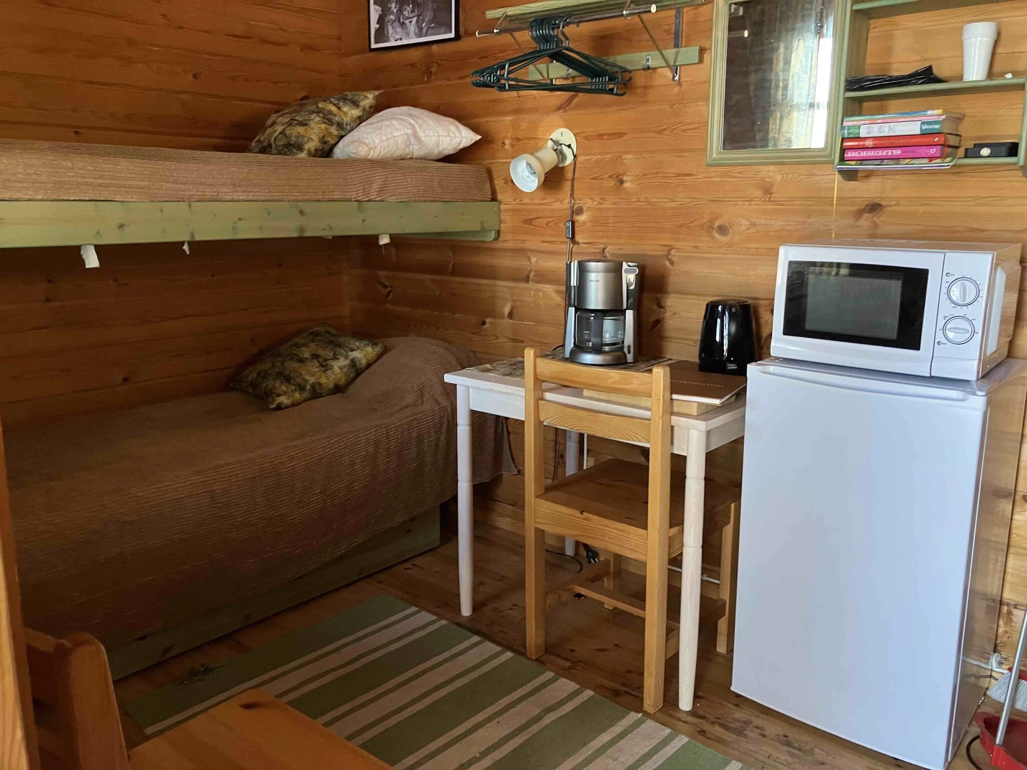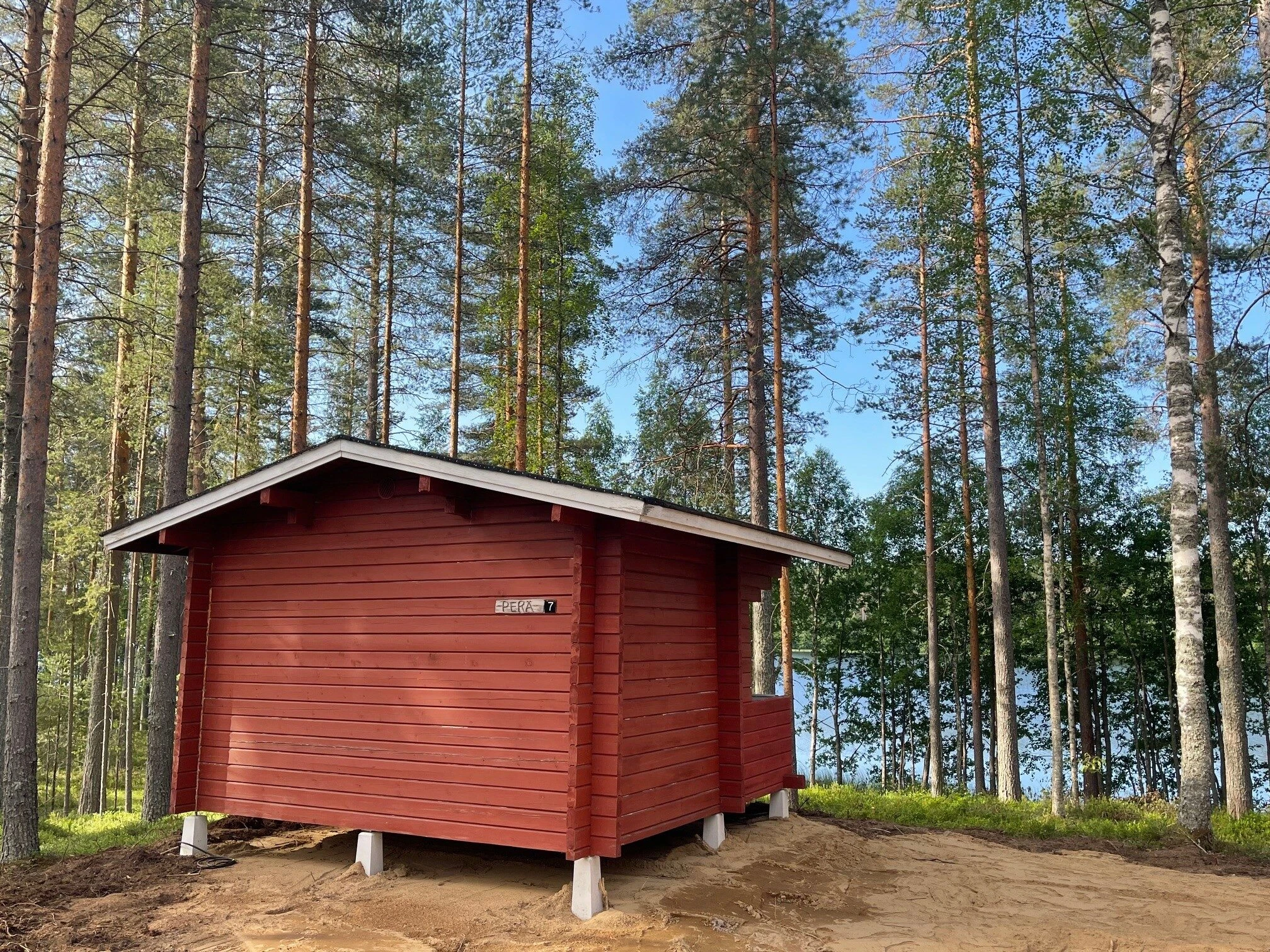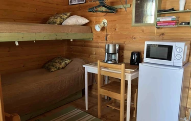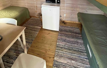 Accommodation close to canoeing and hiking trails. The cottages have a microwave, refrigerator, water and coffee maker, electric heating, blankets and pillows. No linen! Bring your own sheets. The maintenance building has toilets, showers, an electric sauna and a kitchen. The price of accommodation includes a public sauna shift. Check-in at 3 pm. Check-out on the day of departure at 12 pm.